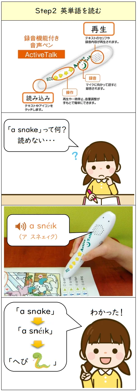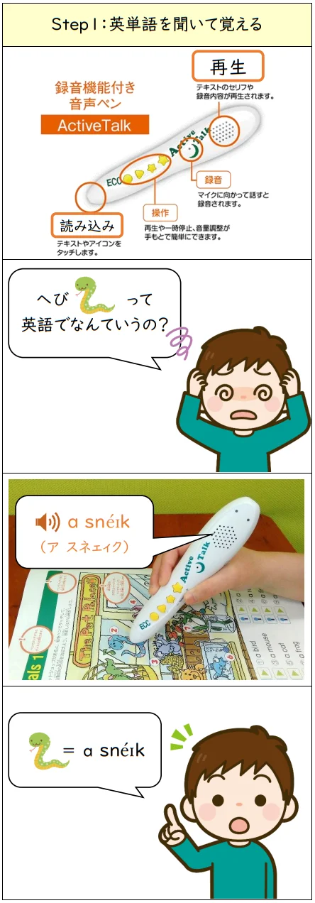 - ECC英検対策コースのテキストと録音機能付き音声ペンで学習を進めます。